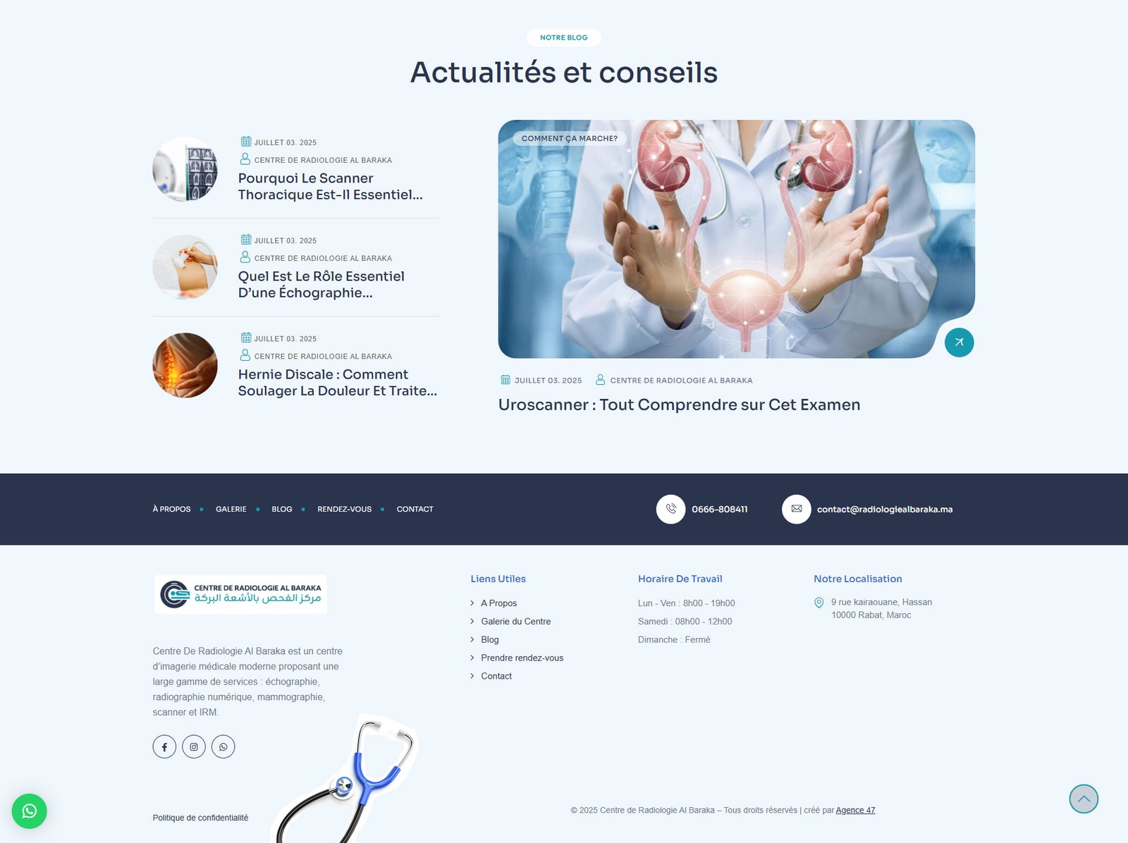 Centre De Radiologie Al Baraka est un centre d’imagerie médicale moderne proposant une large gamme de services : échographie, radiographie numérique, mammographie, scanner et IRM. Un équipe spécialisée vous accueille avec professionnalisme pour des examens précis et un diagnostic de qualité.