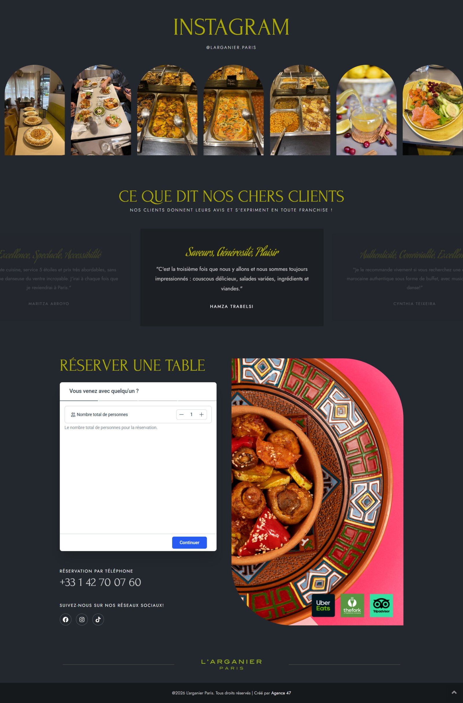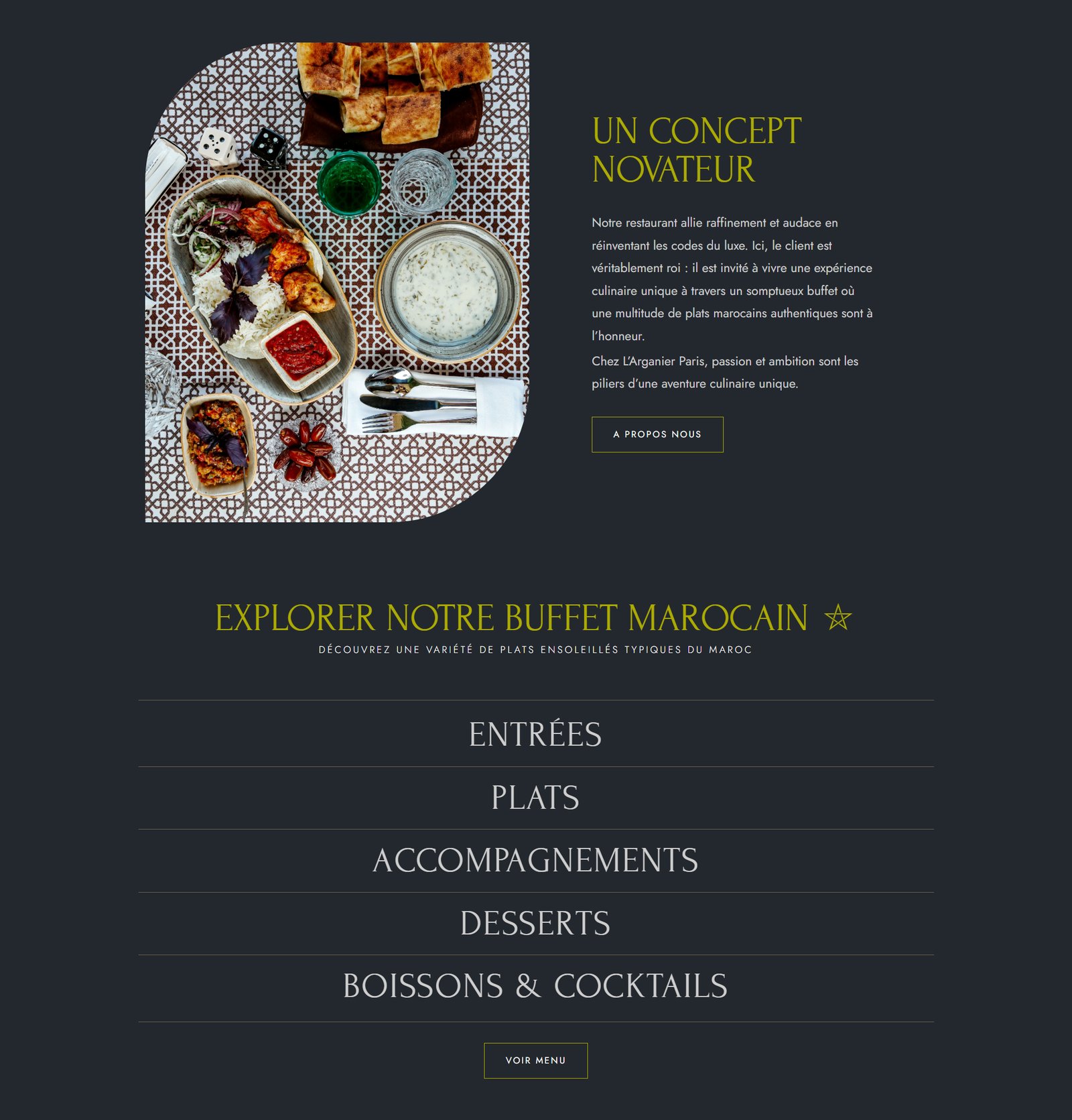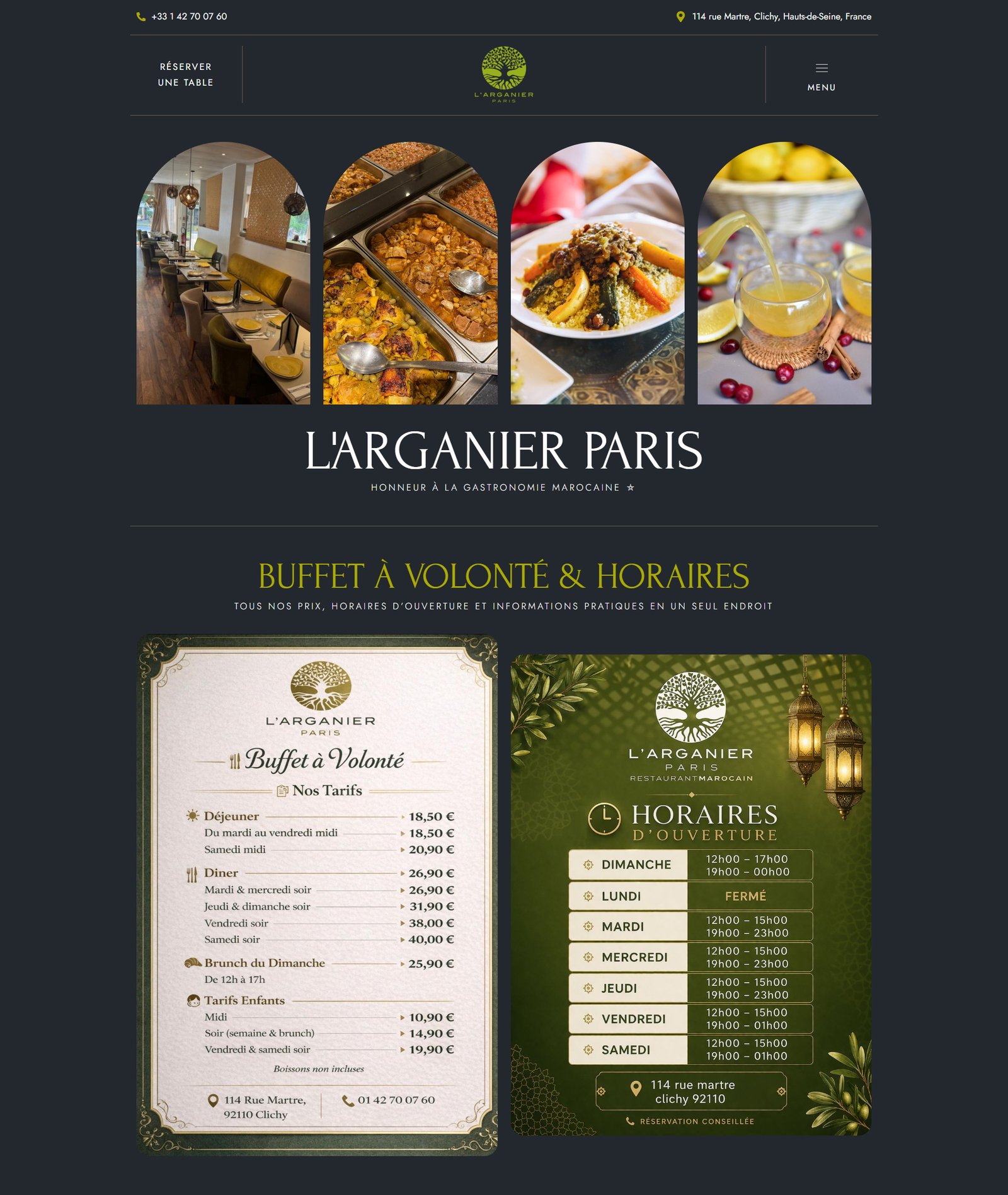 L’Arganier Paris est un restaurant spécialisé dans la cuisine marocaine, proposant un buffet à volonté qui met à l’honneur la richesse et la diversité des saveurs du Maroc. À travers une sélection soignée de plats traditionnels, les clients découvrent une expérience culinaire authentique, alliant générosité, convivialité et raffinement.